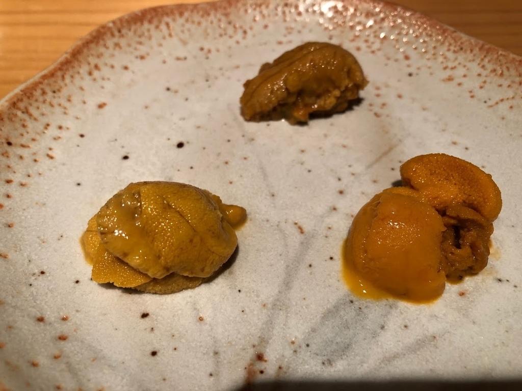 写真は中目黒のお寿司屋さん『鮨 尚充』のウニ三種盛りです。