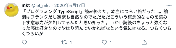 TypeScript の言語仕様について俯瞰でき、フロントエンドやバックエンドと組み合わせて使う方法についても触れられていて、まさに欲しかった内容の本でした。2020 年に出版されたばかりの本なので、内容が古臭くなっていない点も嬉しい。