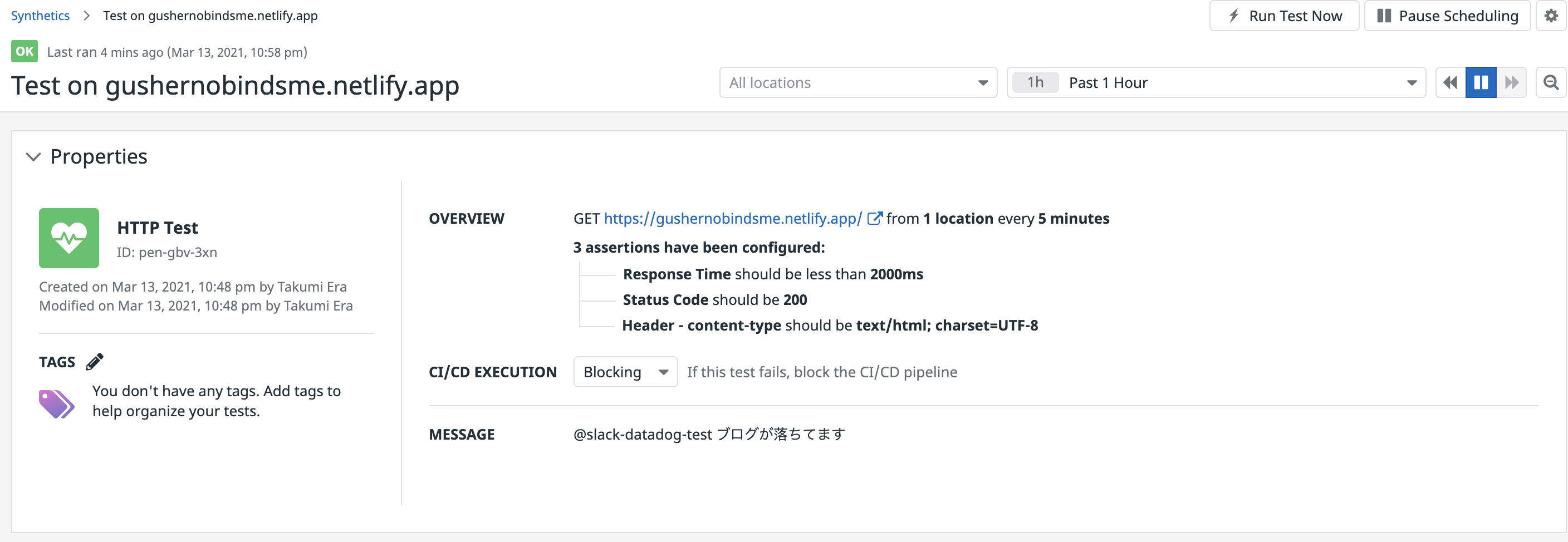 本に書いてあることを参考にしつつ、お遊びでこのブログに外形監視を設定してみたのだけど、驚くほど簡単に設定できてよかったです(Netlify が落ちることはそうそうないと思うけど…)。